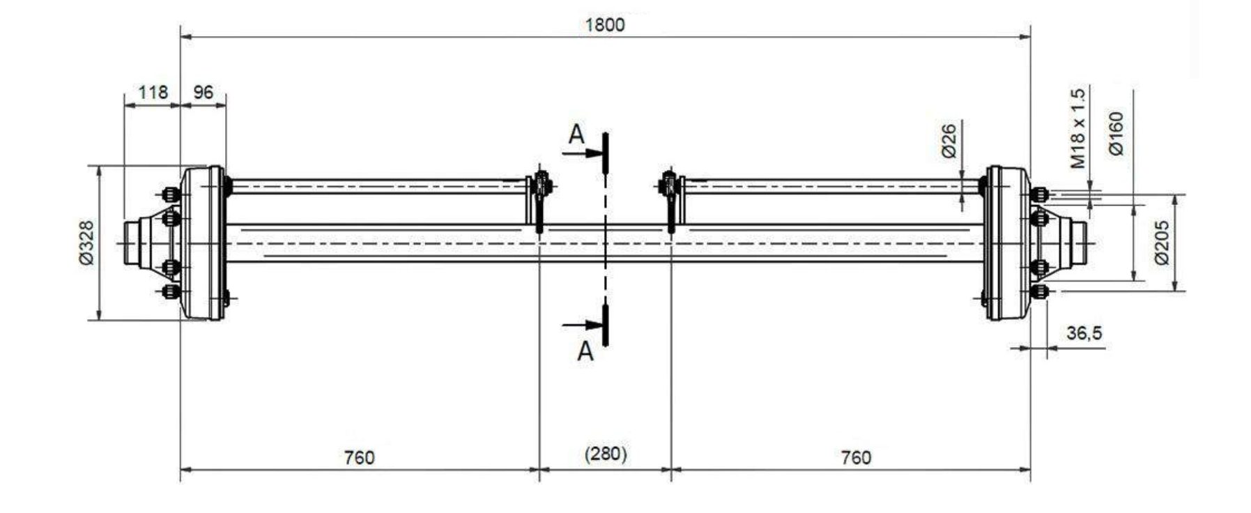 O eixo de reboque com freio é projetado para uso seguro e confiável sob cargas mais elevadas (capacidade de carga de até 7200 kg). O sistema de freio integrado garante uma frenagem eficaz, enquanto a largura de 1800 mm proporciona maior estabilidade na condução, especialmente ao transportar cargas mais pesadas e quando utilizado em vias públicas.