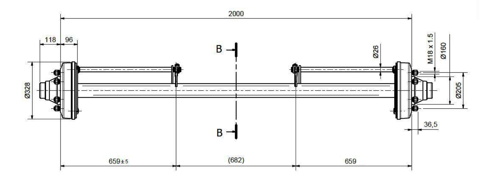 O eixo de trailer com freio é projetado para uso seguro e confiável sob cargas mais elevadas (capacidade de carga até 7200 kg). O sistema de frenagem integrado assegura uma frenagem eficaz, enquanto a largura de 2000 mm proporciona maior estabilidade durante a condução, especialmente ao transportar cargas mais pesadas e quando utilizado em vias públicas.