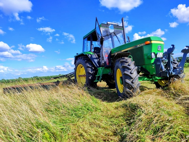 Uma imagem de verão do nosso cliente da Alemanha, que instalou nossa hidráulica frontal universal em seu John Deere 3040. Com a hidráulica frontal, definitivamente aumentamos a eficiência do trabalho com o trator.