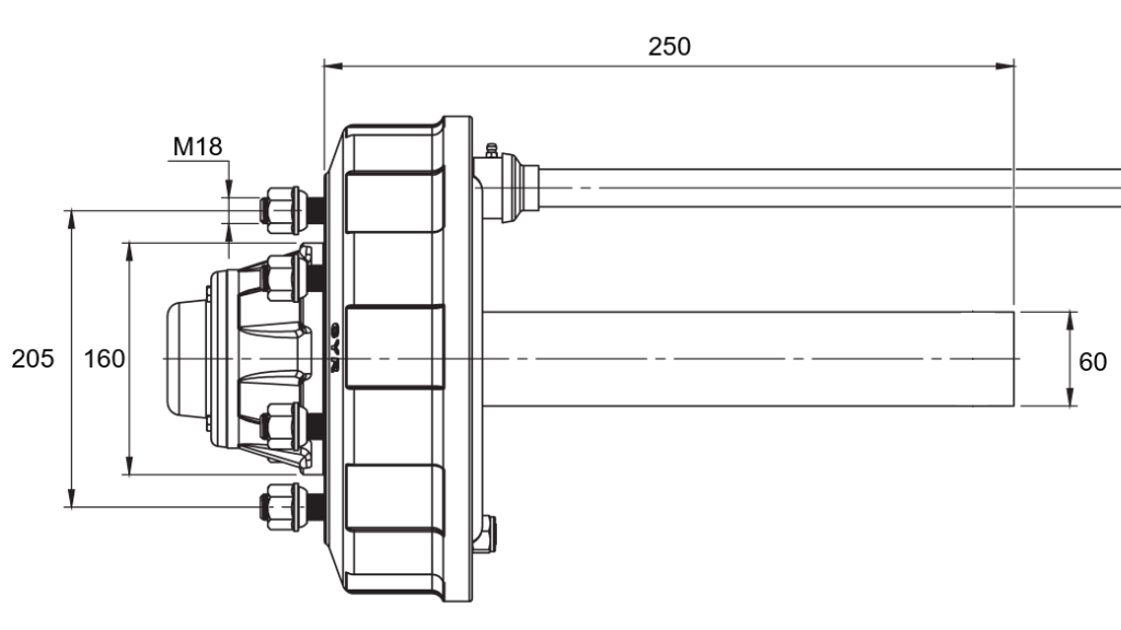 O eixo de suporte é destinado para uso em vários tipos de reboques com sistema de frenagem. O comprimento do eixo de suporte é de 250 mm, com capacidade de carga de até 2700 kg.