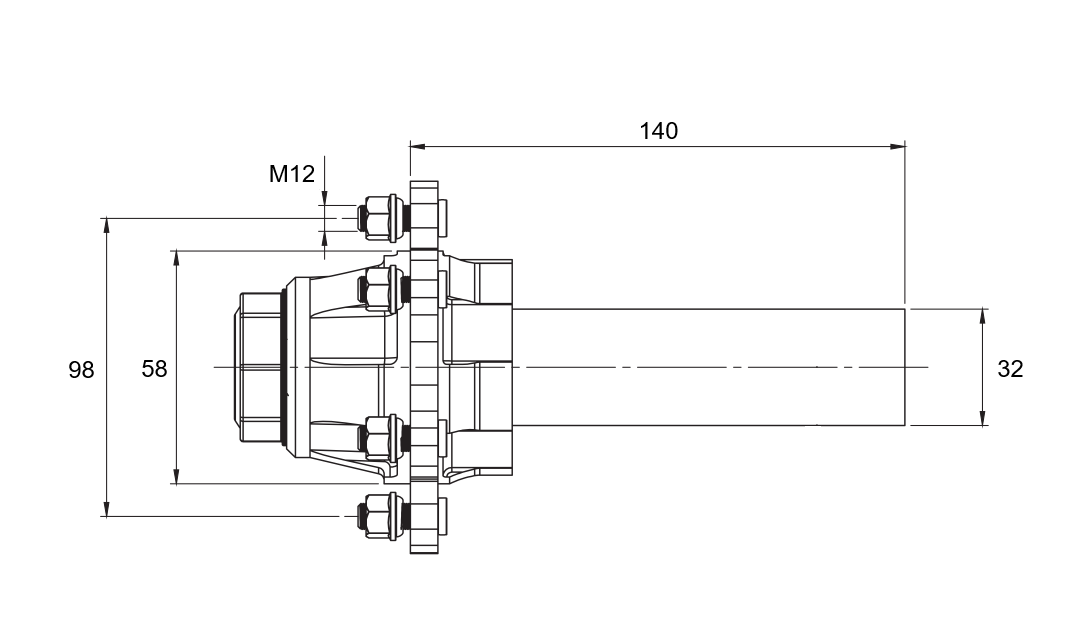 O eixo sem freio é destinado para uso em vários tipos de reboques sem sistema de freio. O comprimento do eixo é de 140 mm, com capacidade de carga de até 500 kg.