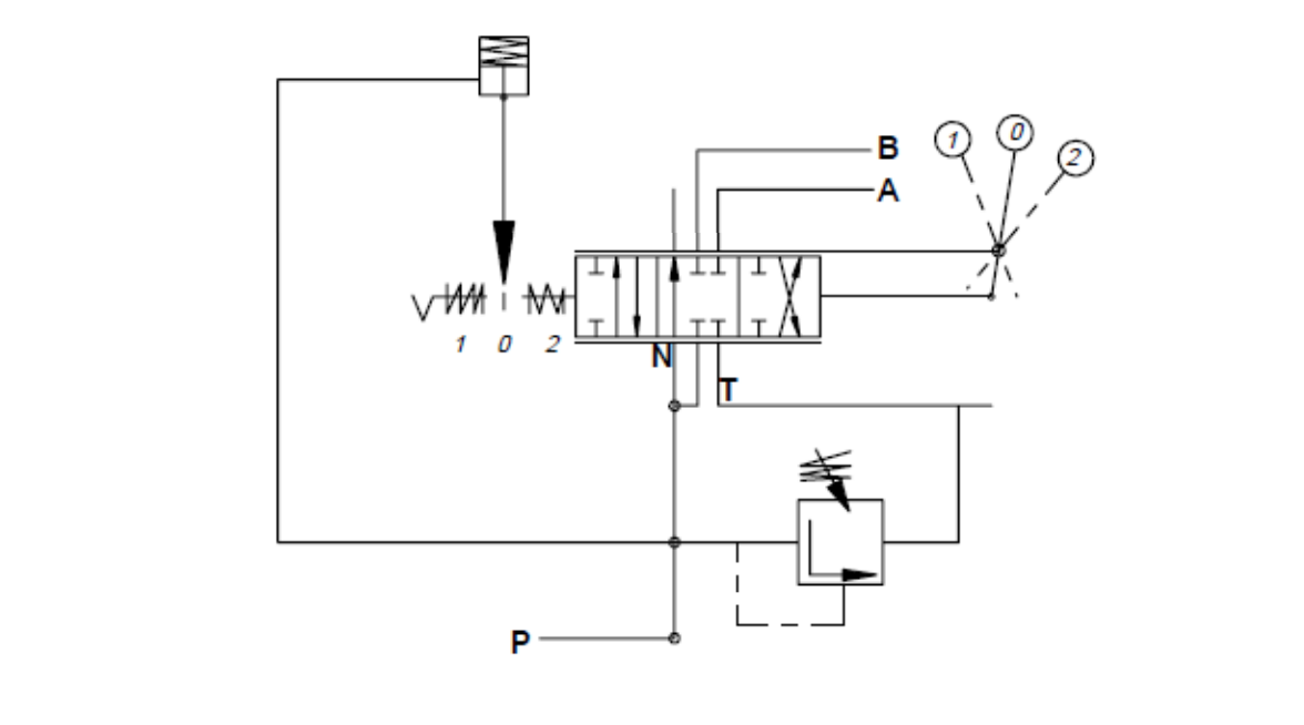 O sistema de pressão kick-out permite que a alavanca seja liberada e retornada à posição neutra. Quando o carrete é movido manualmente para a posição de pressão kick-out, o óleo é direcionado para a seção "B". Quando a pressão na seção "B" excede o valor ajustado, o pino de pressão kick-out libera a alavanca de controle e a retorna para a posição neutra. A configuração de fábrica para a função kick-out é 70 bar.