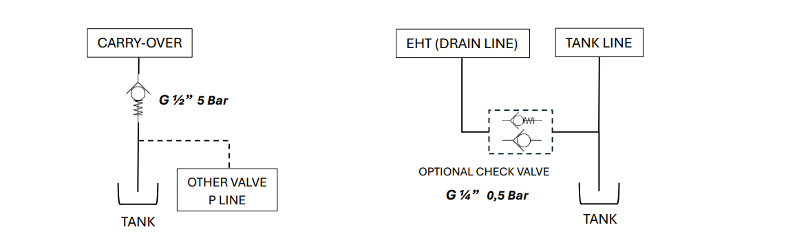 - Se houver duas válvulas na linha hidráulica, conecte a saída carry-over da primeira válvula à entrada de pressão da segunda válvula.