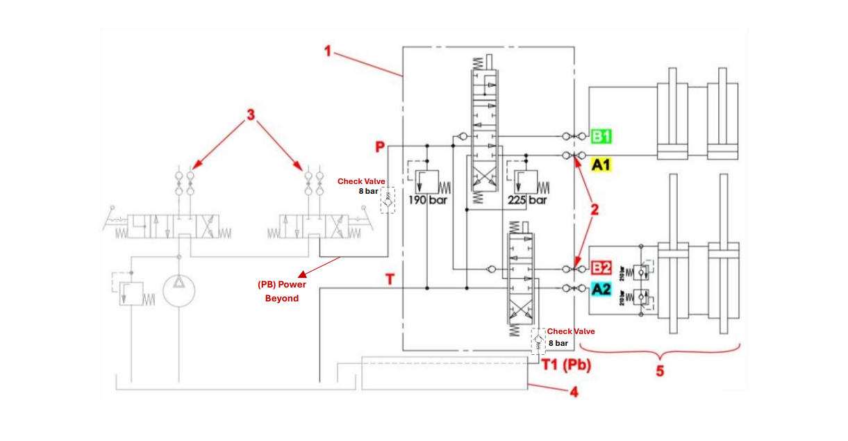- T1 – encaminhamento de pressão (Power Beyond – "PB") + válvula de retenção com mola de 8 bar