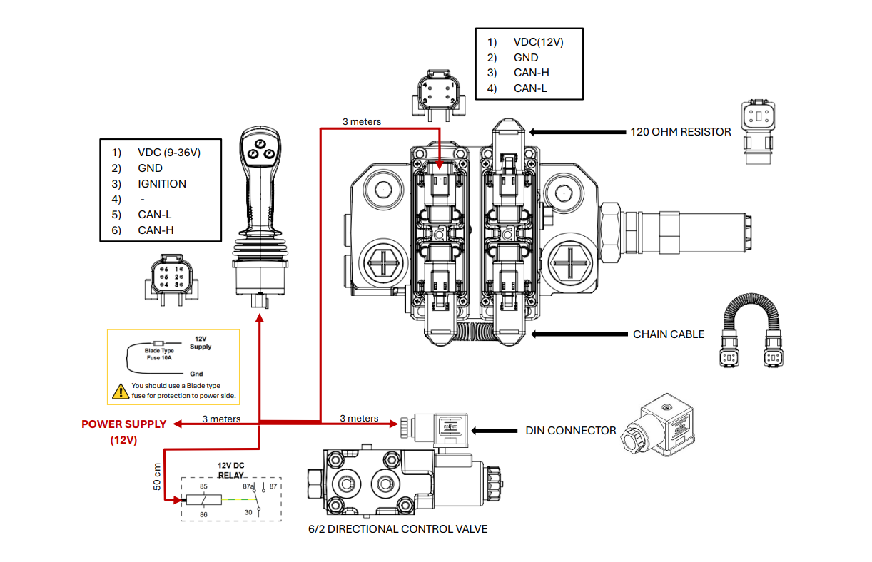 O kit inclui a válvula, um joystick de controle proporcional e a fiação elétrica.